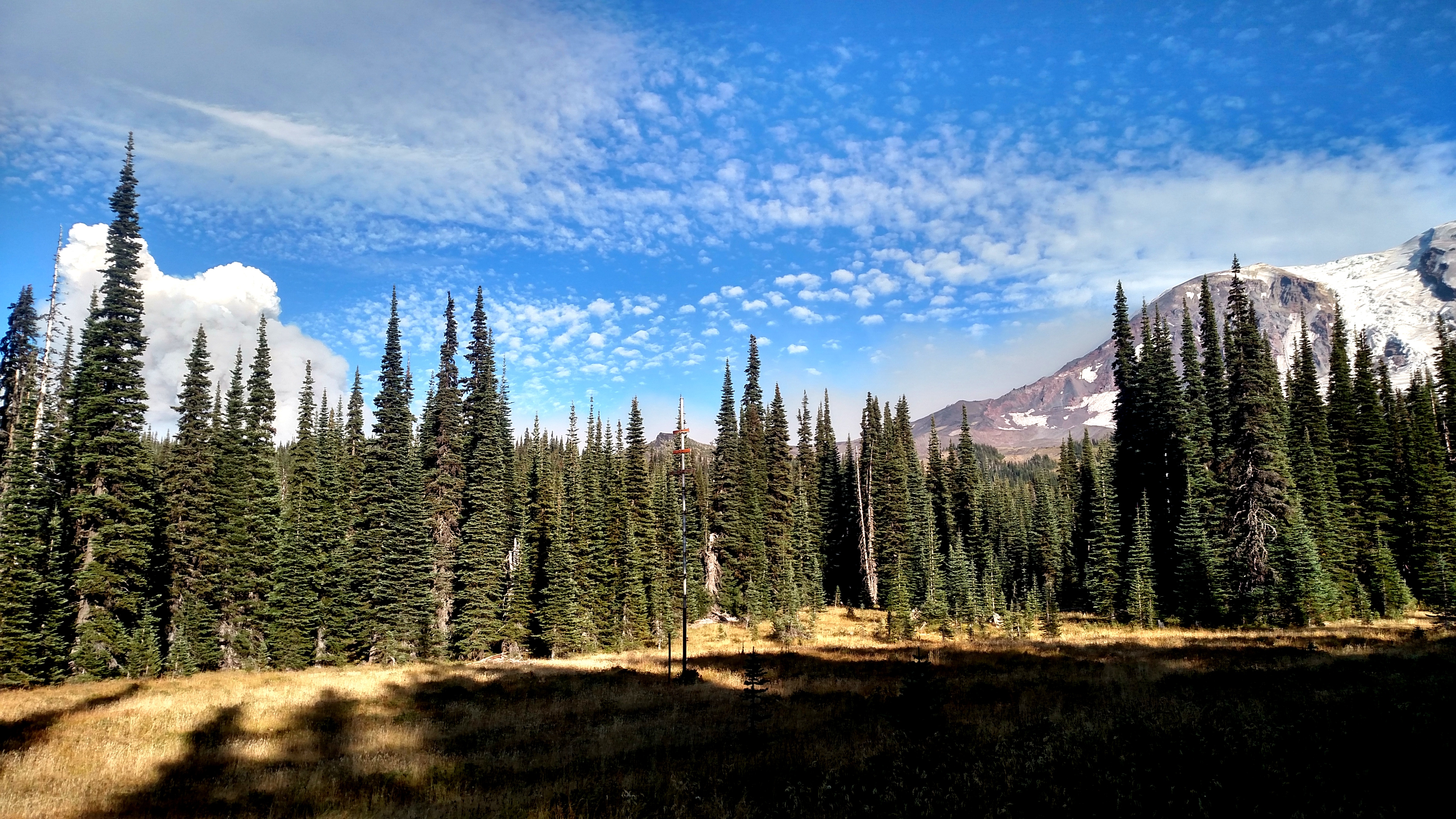 From Panther Creek, we entered the Wind River experimental forest, whose enormous Douglas fir and Western hemlock transformed the wind rustling through their uppermost branches into the sound of a giant, gushing river. We then traveled through the Indian Heaven Wilderness, which I had never heard of but which is a beautiful area characterized by huckleberry-filled forests, rolling hills, and occasional views of Mount Hood to the south and Mount Adams to the north.
