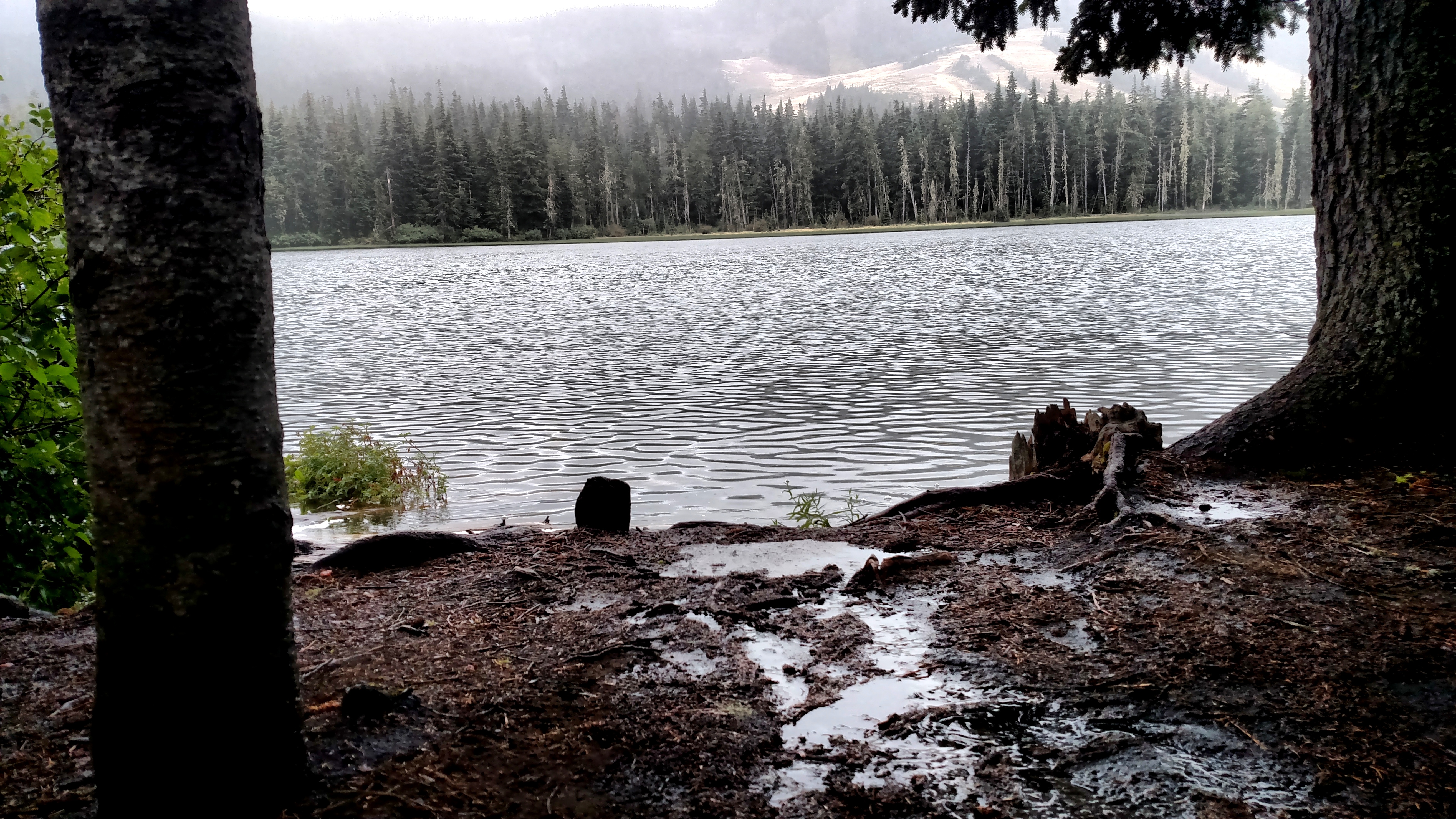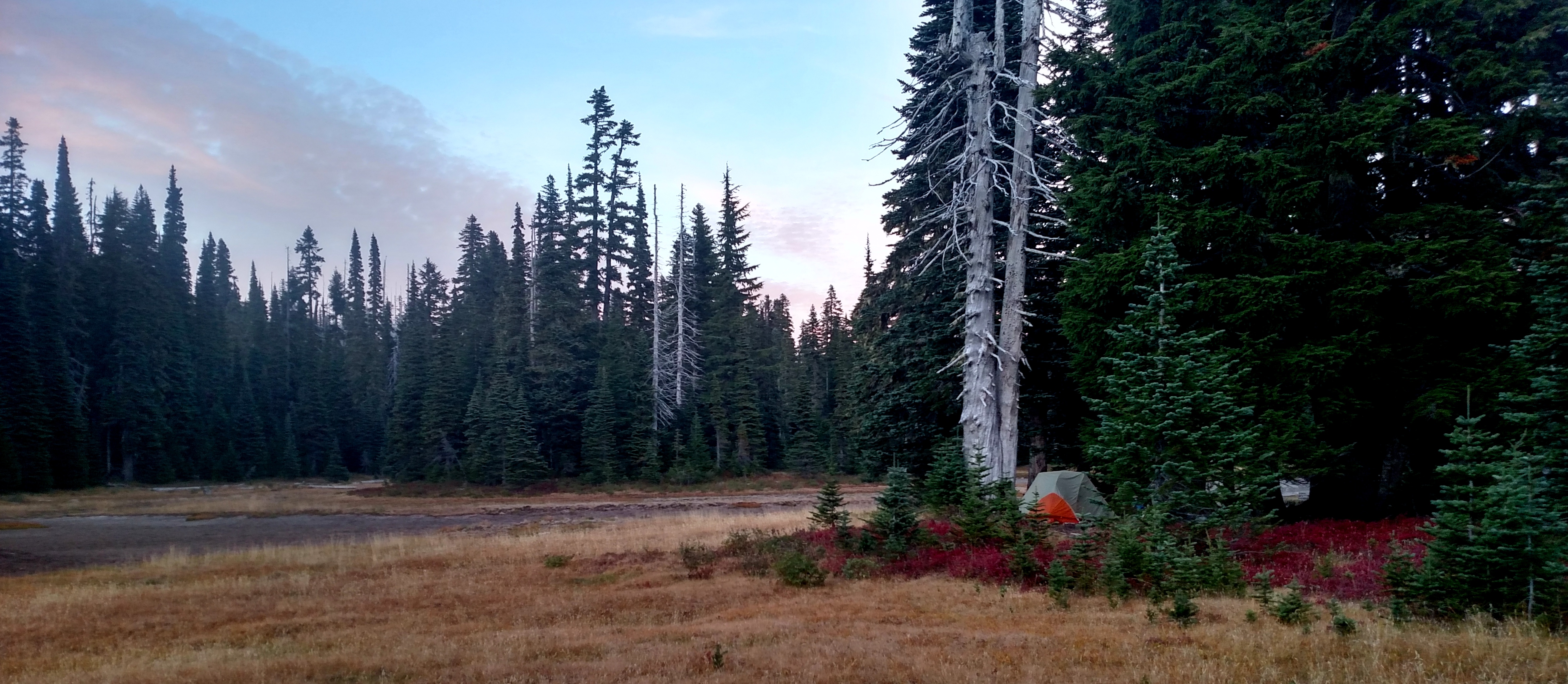 The timing seemed perfect. The front end of the storm we experienced during our final days in the Goat Rocks Wilderness had moved in with full force, and several inches of snow fell in the upper reaches of the Washington Cascades over the next few days. I later spoke with three German hikers—whose trail names were Happy Oats, Messy Fruit, and Captain Quick—who said they had been forced to camp along the Knife’s Edge and wait for the storm to pass. Others exited the trail altogether and rejoined once the weather improved. The picture below shows our final, rain soaked campsite at White Pass, which as you can imagine, we were not too terribly sad to leave behind.