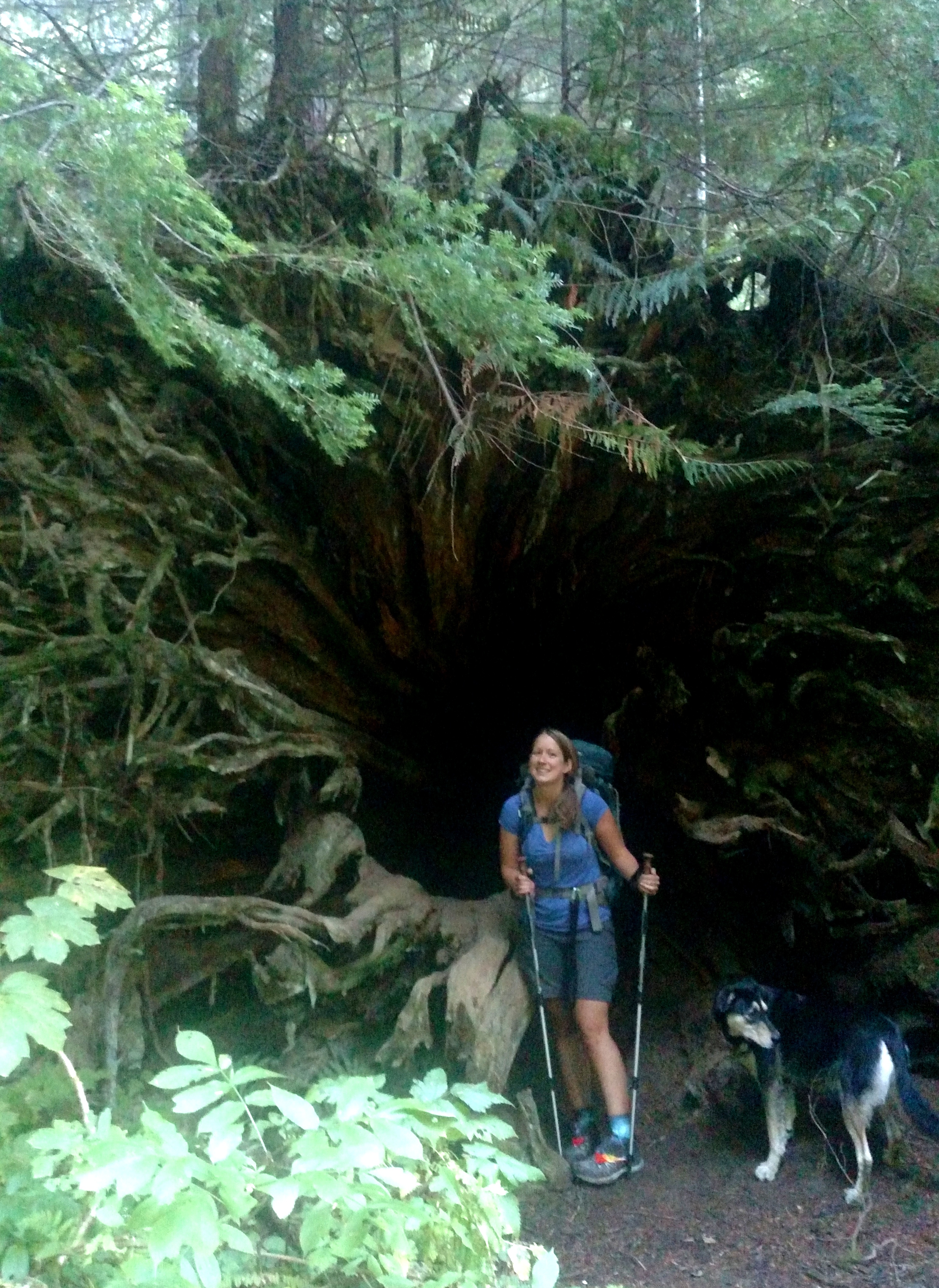 I stand dwarfed by a giant tree trunk