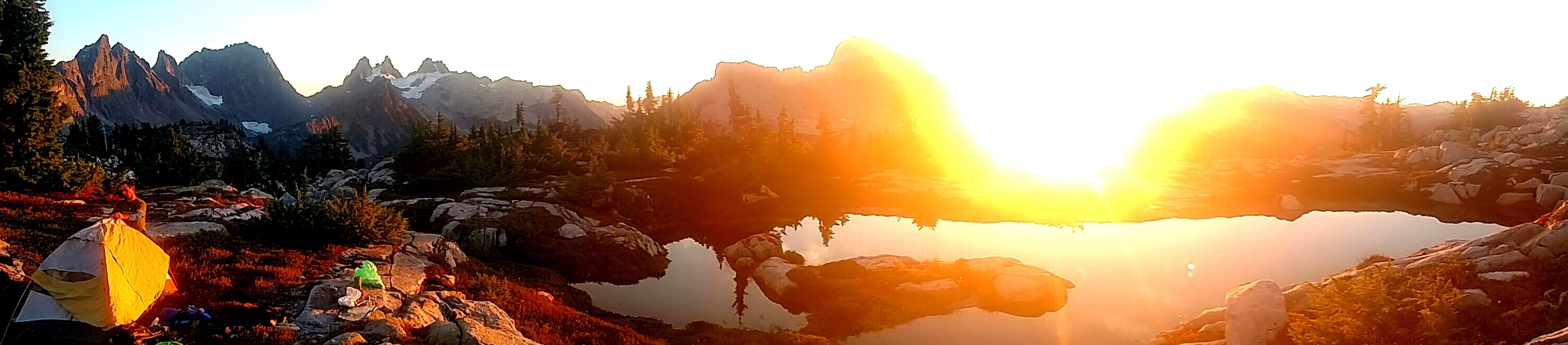 This hidden paradise tucked away high in the mountains is unlike any other place I have ever been—a peak-filled heaven on earth.  And we had it all to ourselves.  The only hard part was deciding where to camp.  There were so many incredible campsites, and we were determined to choose the perfect one.  This was no easy task, as they were all spectacular.  Nathan wandered back and forth across the basin multiple times before we finally settled on a spot at the far end of Tank Lakes with a close-up view of the nearby peaks.  Although they must have been only a fraction of their normal size, it was refreshing to see their glaciers given how little snow remained in the mountains after such a warm summer.