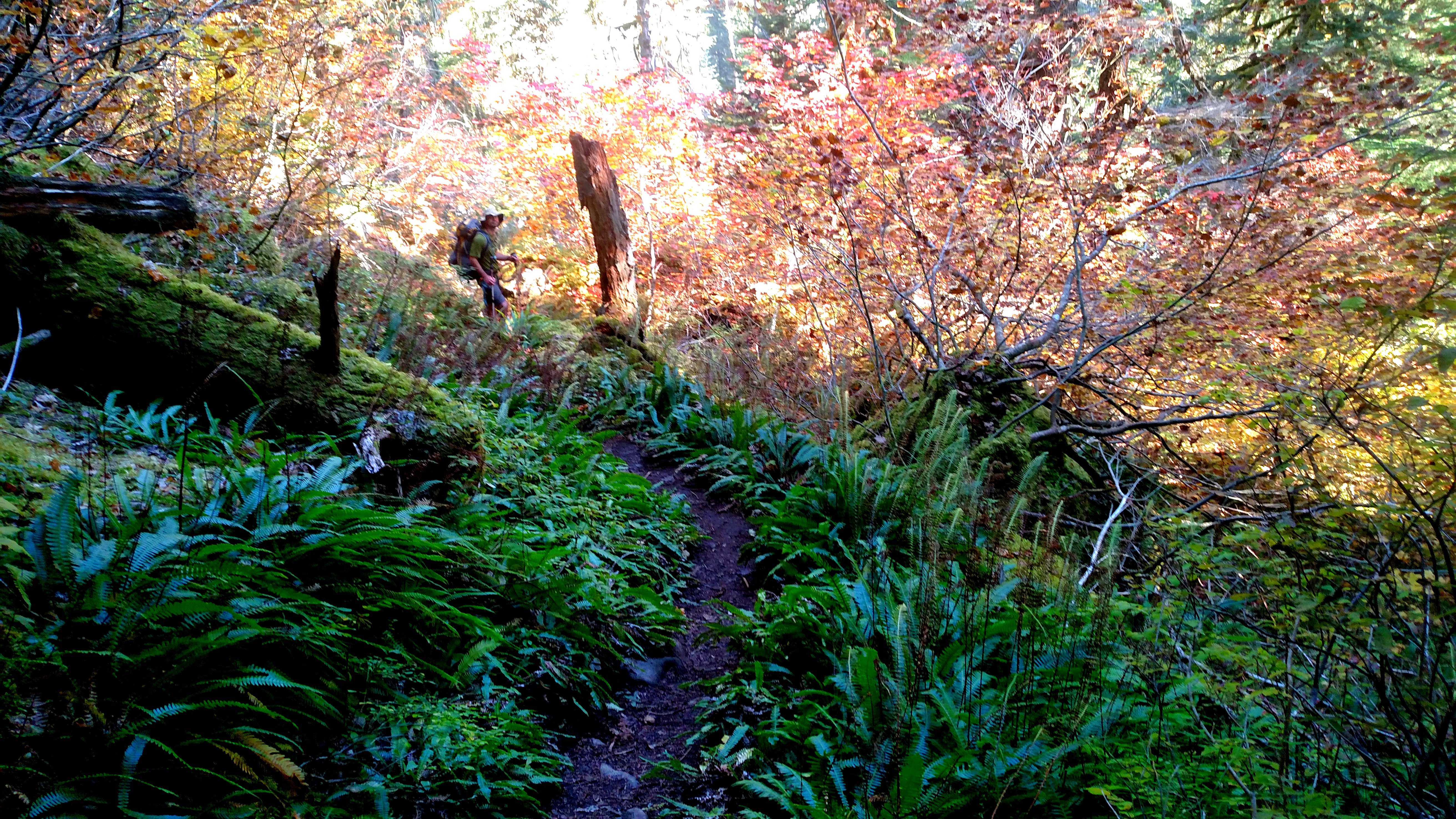Nathan on the trail up to Necklace Valley, the foliage around him shifting from greens to bright reds and yellows.