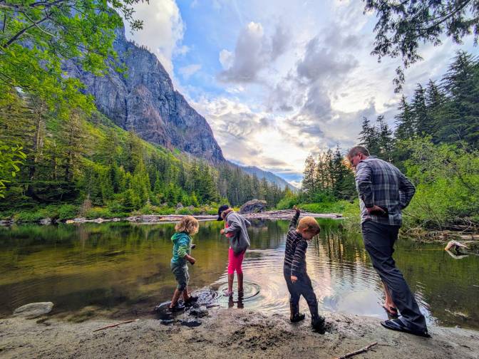 At only 2.2 miles to the lake (4.4 miles roundtrip) and just 500 feet of gain, this trail is one of the easiest around. But the terrain makes it feel like a true wilderness adventure, especially for the littles. I’ve always thought that the trail to Barclay Lake has the feel of a more serious Cascade hike, nestled in the thick old growth forest, replete with river crossings and peek-a-boo views of the towering massif of Mount Baring towards the end.