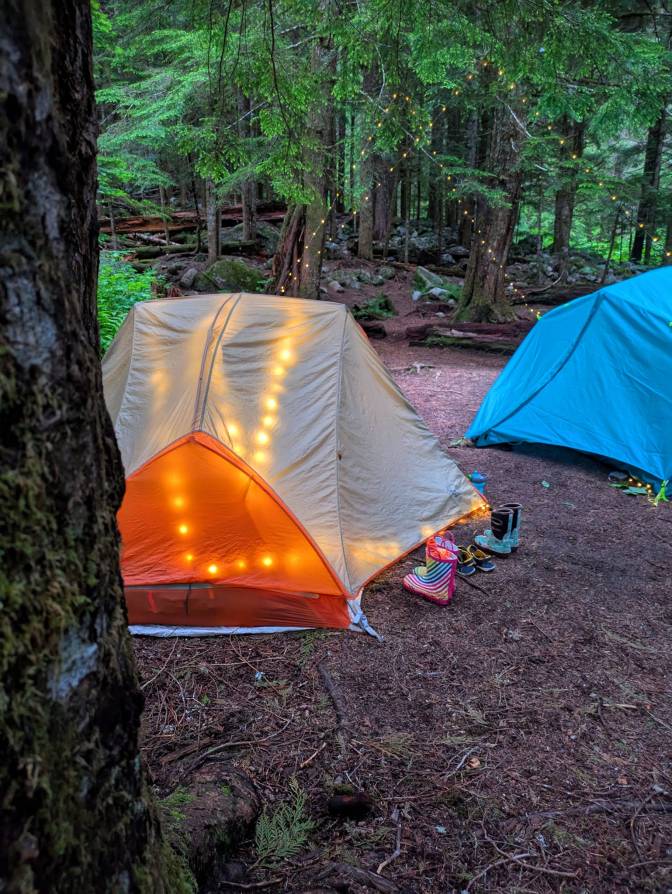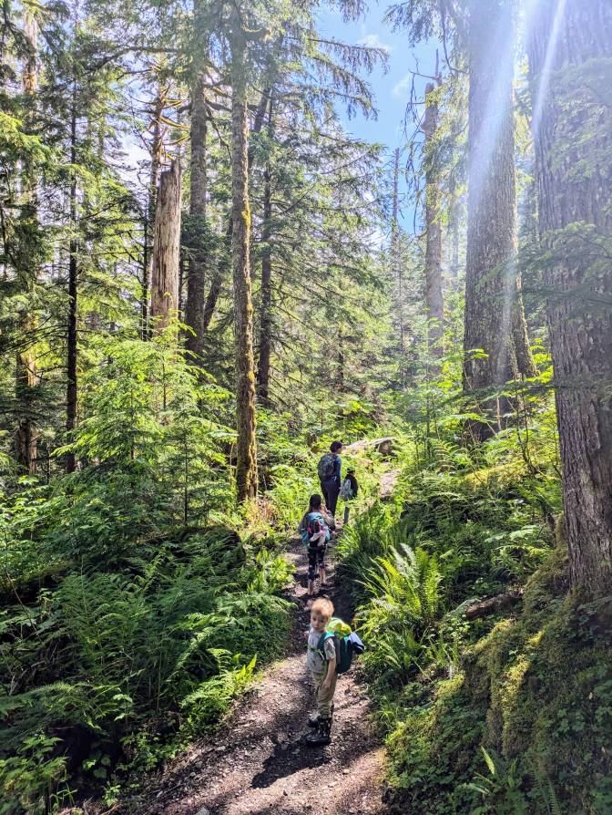 In between mealtimes and playing make believe amidst the moss-covered logs and overgrown ferns, we had plenty of time to explore. We walked the length of the lake, checking out different campsites along the way (there were many). The kiddos also enjoyed using the backcountry privy, nestled in the trees high above the lake.