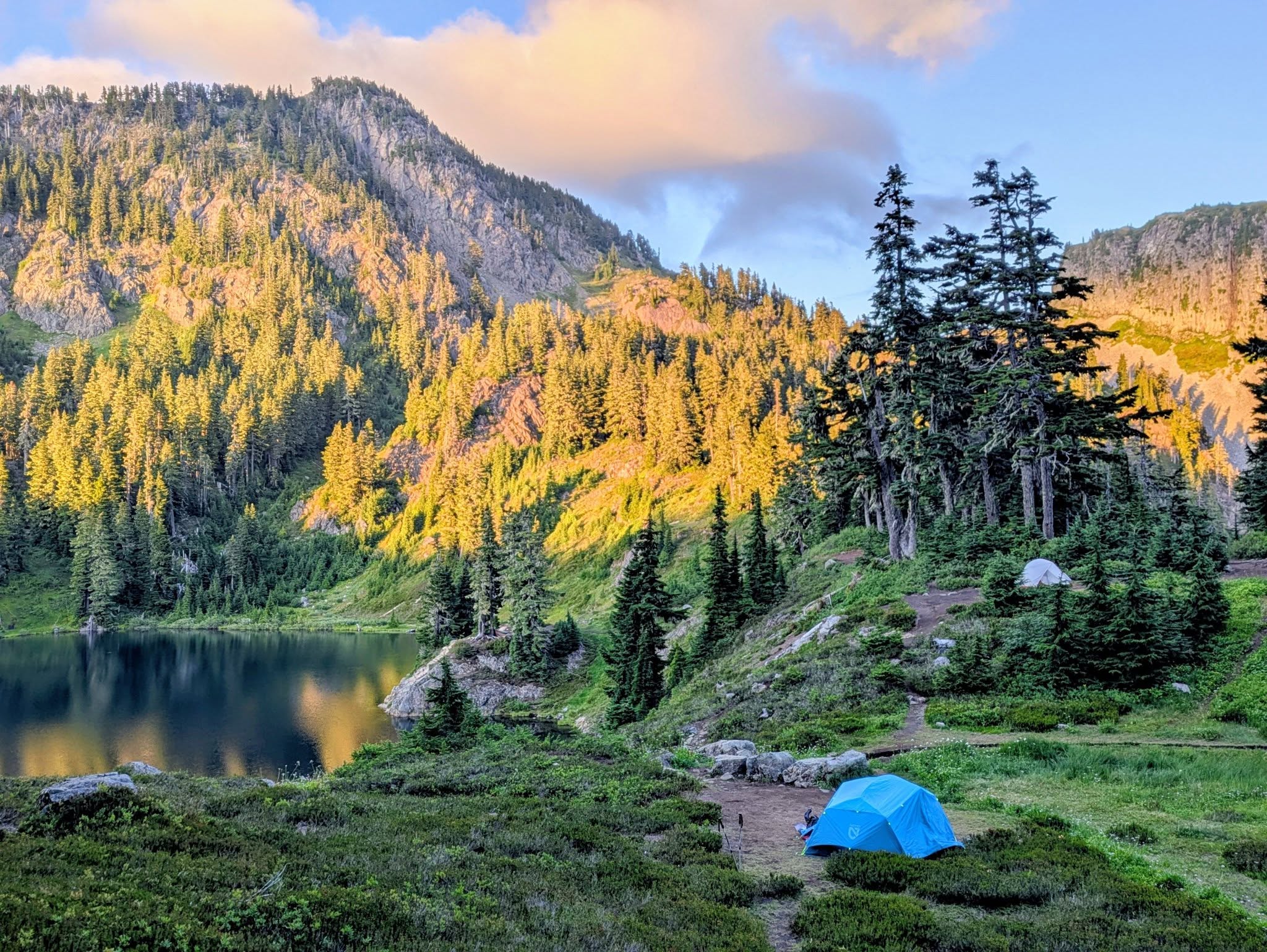 Although there were a couple of decent campsites available at Mazama Lake, we decided to push onwards to Iceberg and Hayes because we knew the views would just keep getting better. We stopped for a few minutes to enjoy the wildflowers at Iceberg before ultimately settling on a lovely little site, perched on the ledge overlooking Hayes.