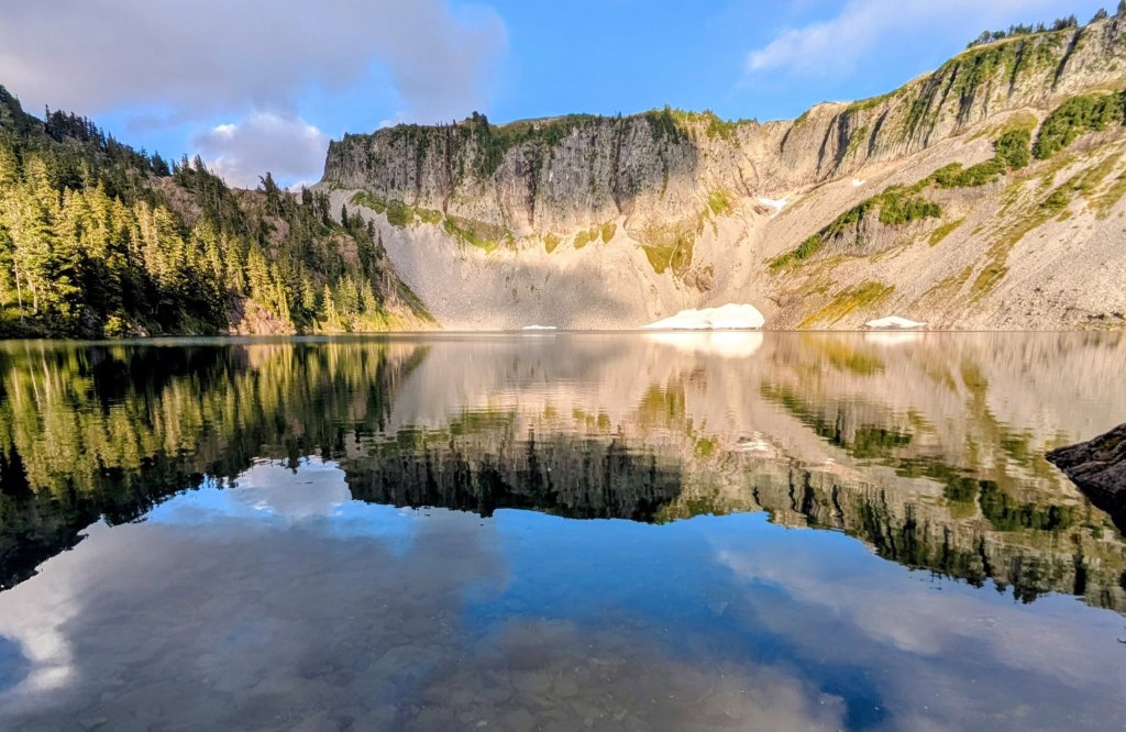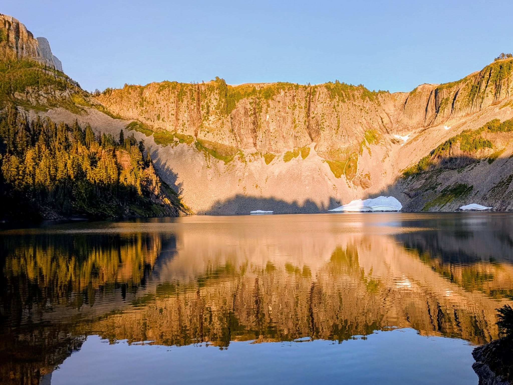 I was surprised by how many campsites there were, scattered between the three lakes–more than I had expected from reading others’ descriptions online. I would estimate that there were about a dozen around Hayes Lake alone. There was also a privy nearby with peek-a-boo views of Table Mountain’s giant cliffs surrounding Iceberg Lake. In my opinion, the shores of Iceberg were the best place to watch the sunset–I can never get enough of that orange alpenglow.